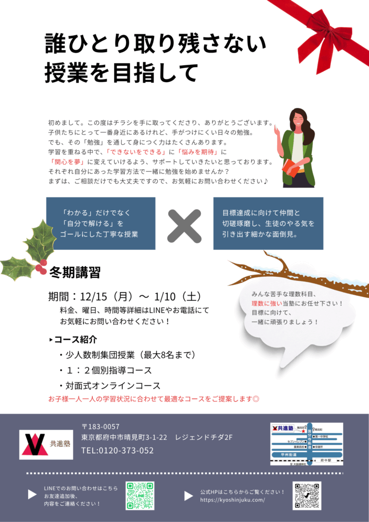 【北府中駅近く:個別塾/集団塾】☃️冬期講習受講生受付中☃️